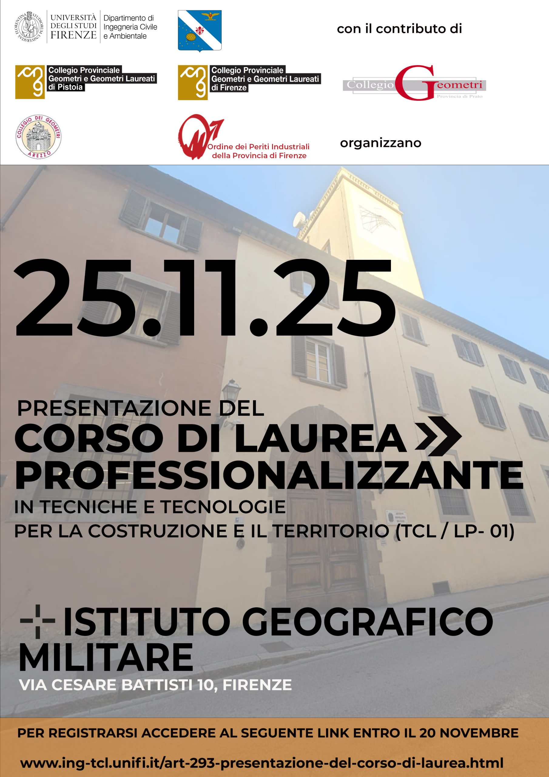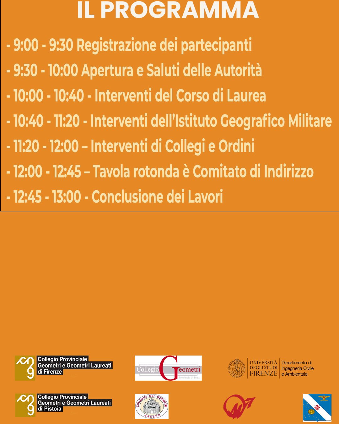 πΒ Nel corso della mattinata si alterneranno interventi del Corso di Laurea, dellβIstituto Geografico Militare e dei Collegi professionali, seguiti da una tavola rotonda con il Comitato di Indirizzo.